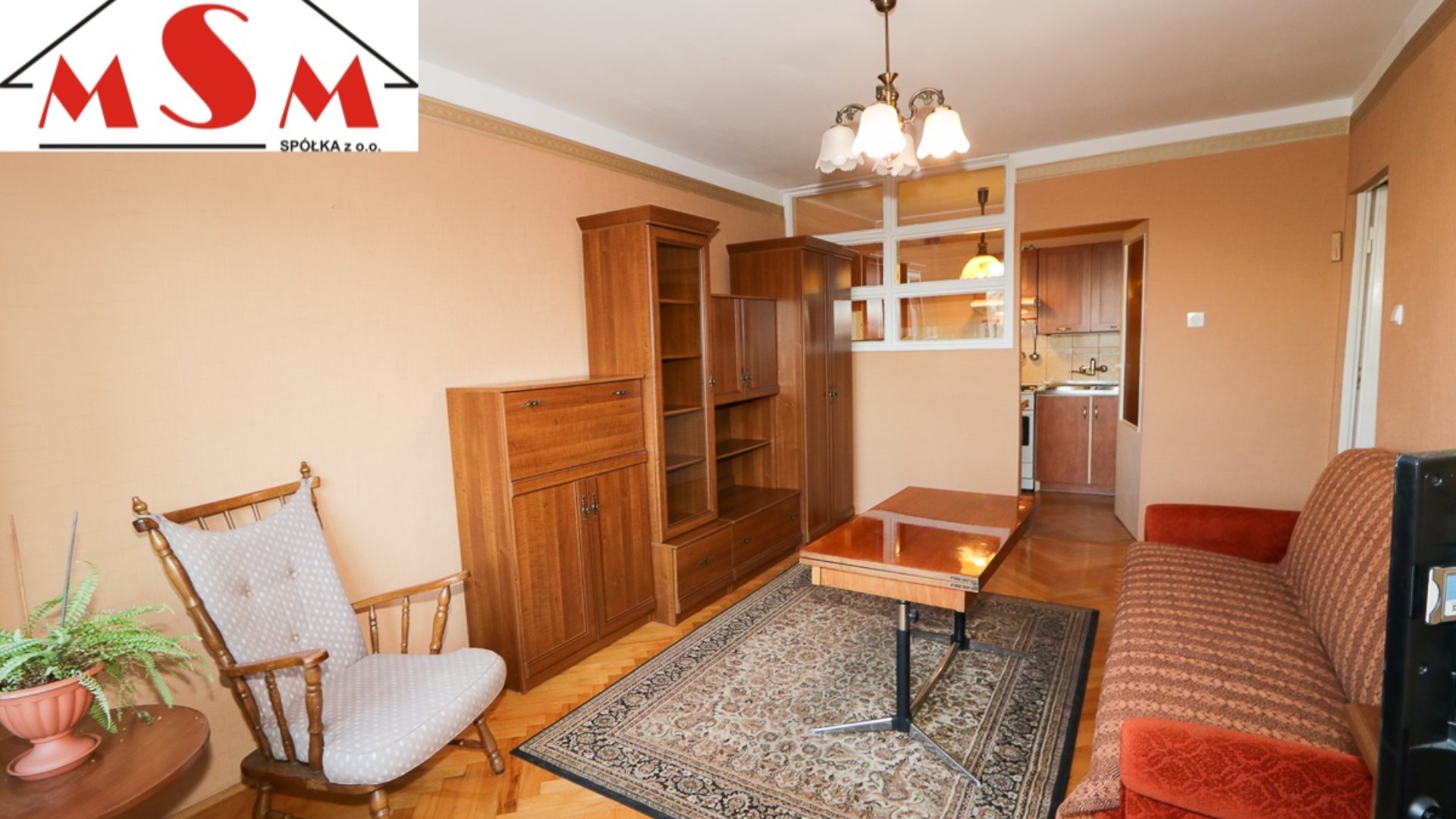 Mieszkanie składa się z salonu z którego przechodzi się do kuchni oraz drugiego odrębnego pokoju.